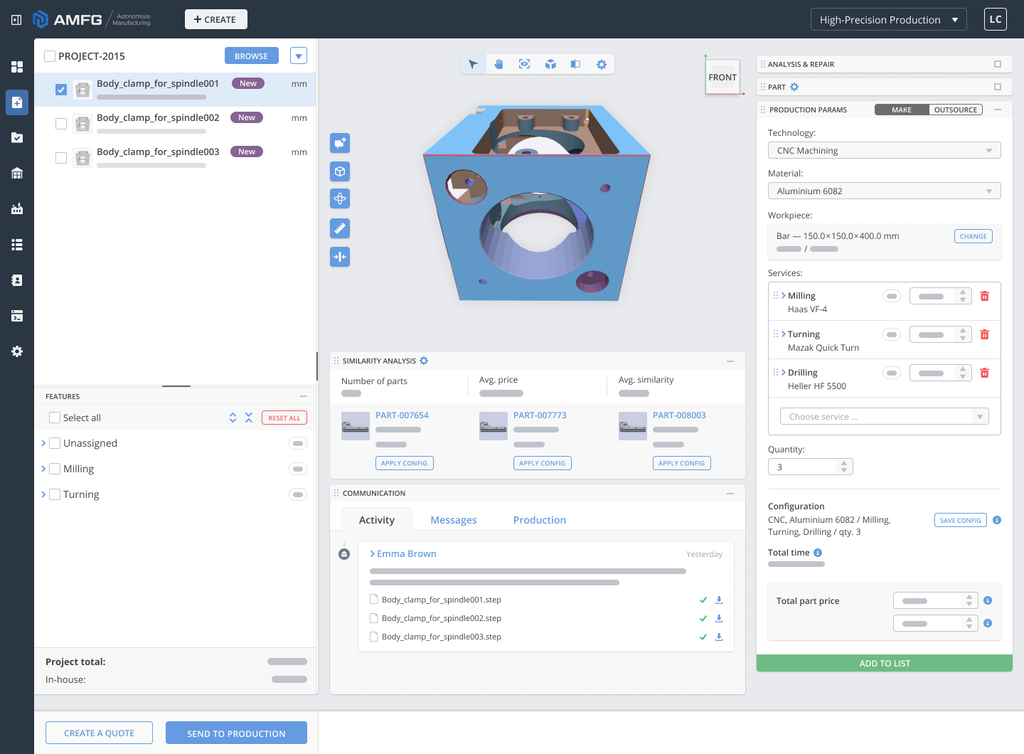 Simply convert a quote from your emails, or drag and drop a CAD file into your AMFG app. No matter the complexity, AMFG’s algorithms intelligently calculate accurate time and costs, enabling you to auto-draft a finished quote in minutes.