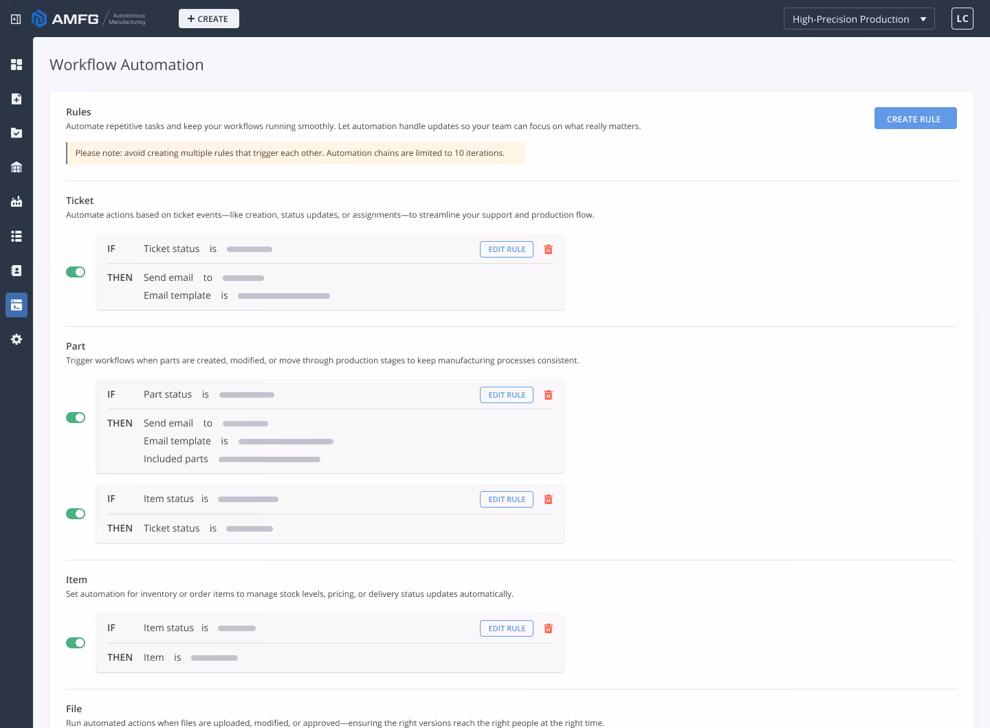 You can build automation routines directly in AMFG’s interface using drag-and-drop logic, triggers, and conditions to connect every step of your production workflow.