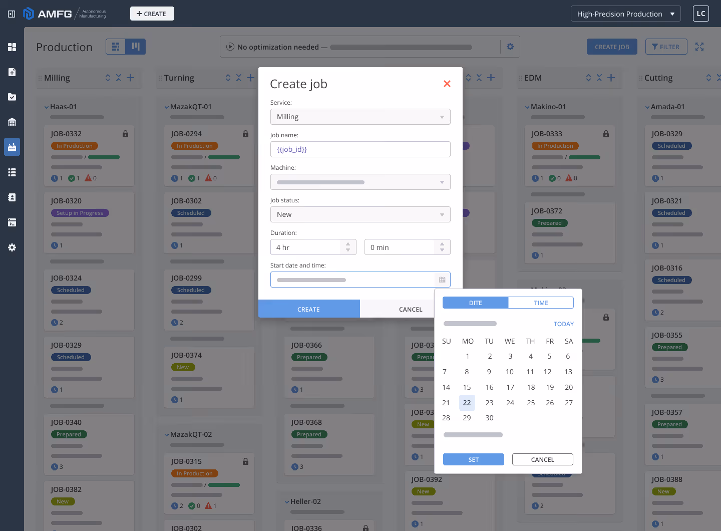 A form in AMFG to create and schedule a job. It shows a calendar used to schedule the job, and check boxes for the service, job name, machine type, status, duration, and start date and time.