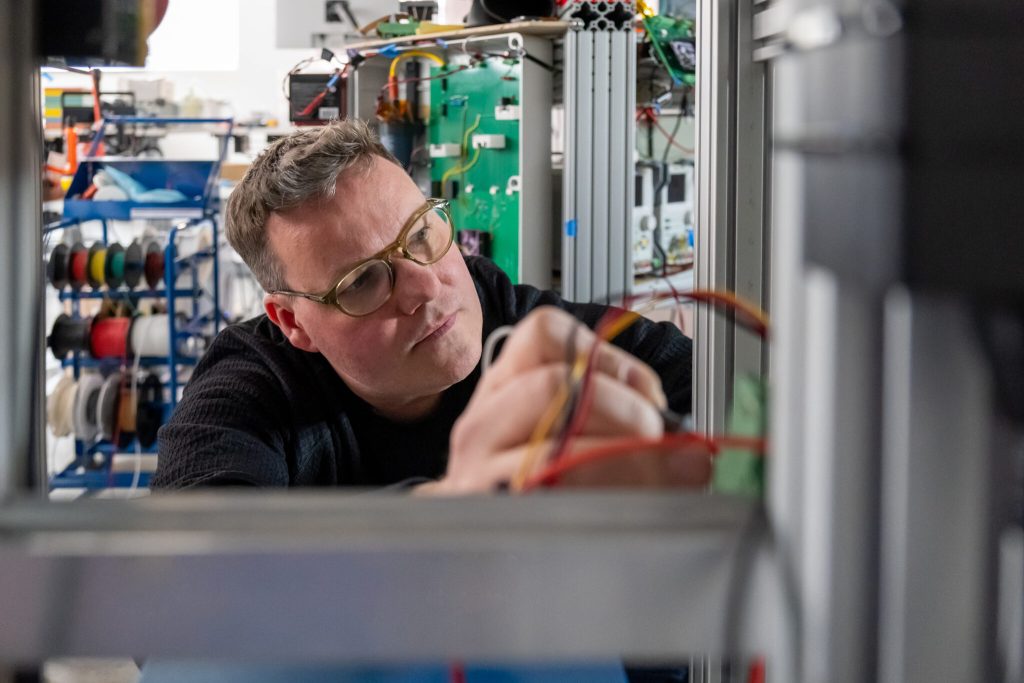 Fluent Metal Co-Founder Peter Schmitt working on a prototype of the metal 3D printer. Image courtesy of Fluent Metal/Andy Ryan.[/caption]